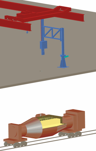 This type of equipment has been the only solution on several occasions when over head cranes etc. have limited the height available for a standard system. Click to see animation
